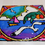 輪郭を描き終わったら、プラバンをひっくり返して裏側に着彩をします。(色が混ざって汚くなってしまうのを防ぐためです。)キャラクターはポスカで着彩しました。(ポスカは擦ると色が削れてしまうので注意が必要です!)