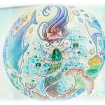 ちなみに、人魚の髪の毛の先・クラゲのひらひら・水の模様など、透明感を出したい部分は、油性マジックのマッキーで塗りました。白いポスカで塗った水の波紋の模様の輪郭は、カッターで削って色を薄め、白の太さを調整したりしてみました。