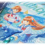 今回の作品では、海の透明感の青にはマッキーを使って、人物の肌にはポスカを使うなどしました。アニメのセル画みたいな感じで、細部の輪郭を描いてから、絵の裏側を塗ります。(塗った部分はボコボコしてしまうので、こちらが裏側にくるように描きます。)