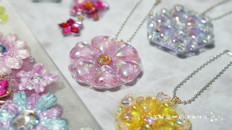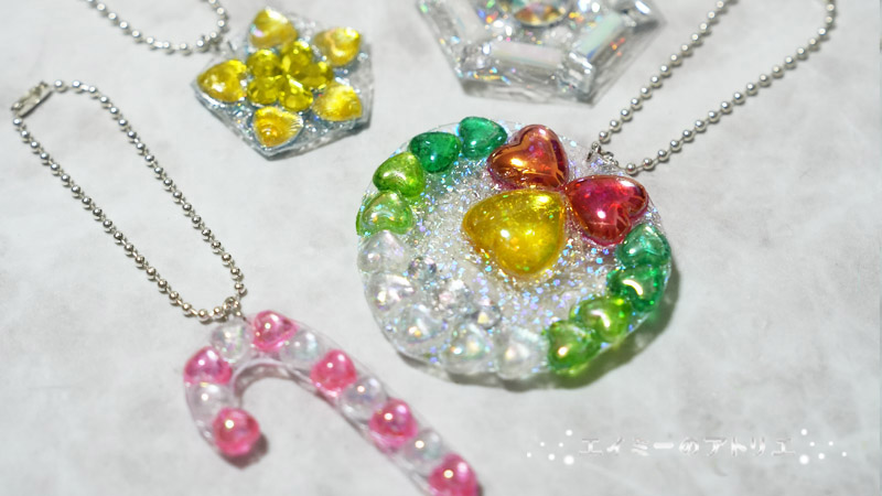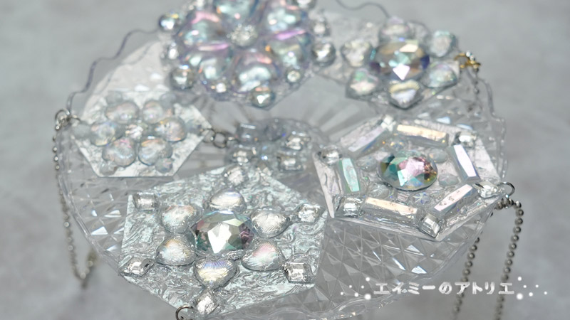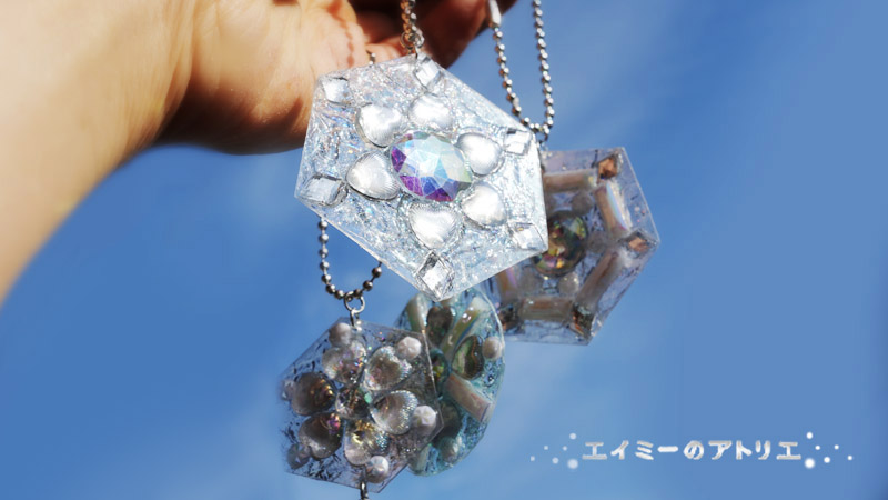 乾いたら、ハサミで下敷きを六角形に切ります。裏側も同じようにラインストーンを貼り付けると、オーナメントにボリュームが出ます。表&裏が完全に乾いたら目打ちで穴を開け、Cカンとチェーンを通したら完成です。