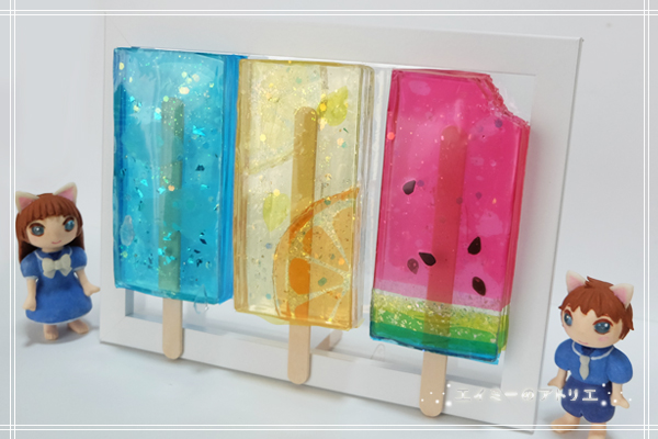 信号機カラーのようなアイス、レモンアイス、スイカアイスを並べてみました。光に当てるとキラキラ光って本物のアイスキャンディーのようです。触ってみると、かたくもやわらかくもなく、アイスっぽい感じがします。