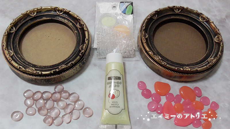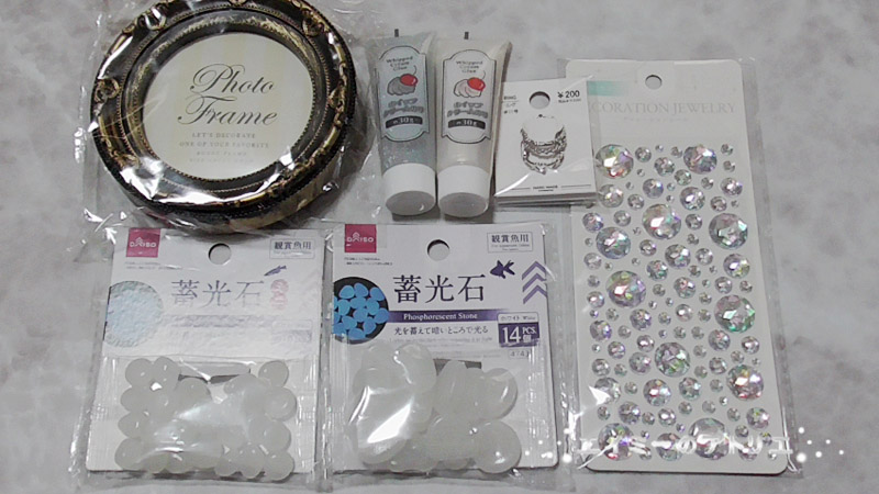 フォトフレームの中に蓄光石を敷き詰めて、プラバンにダイソーのミラー風シートを貼り付け、ラインストーンで飾りをつけてみました。大人っぽくてちょっとお洒落な感じになりました。