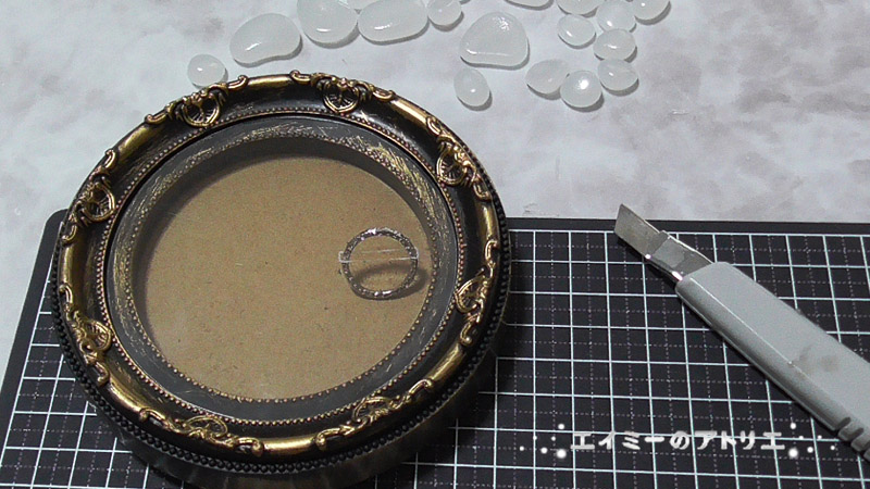 フォトフレームの中に蜘蛛の巣を作り、蜘蛛は指輪として脱着できるようにします。プラバンをフォトフレームの溝に置いて固定できるサイズに切り抜き、指輪の入れられる穴を開けます。