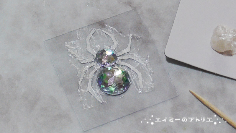 蜘蛛の指輪を透明の下敷きで作ります。ラインストーンを接着剤で貼り付けて、手足を銀色の油性マジックで描きます。ホイップクリームのりを全体に塗ってコーティングします。※ラインストーンを接着してからだと細部を切りにくくなるので、ハサミで切ってからラインストーンを貼るべきでした。