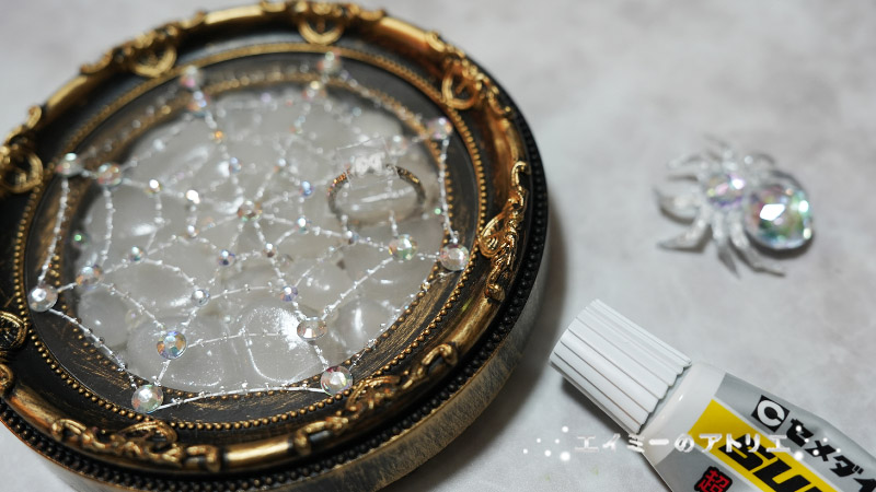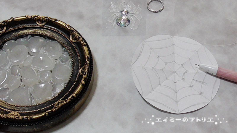 フォトフレームの中をホイップクリームのり(ラメカラーホワイト)で塗ったら、蓄光石を敷き詰めてビーズで間を塞ぎます。プラバンのサイズと同じサイズの円型に切ったコピー用紙に蜘蛛の巣を描きます。