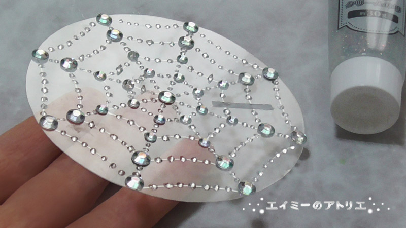 プラバンに銀色の油性マジックで蜘蛛の巣を描き、ラインストーンを貼り付けていきます。セリアで購入できる、大小様々のオーロラカラーのラインストーンを使いました。光に当てると雨粒みたいでに輝いて綺麗です✨