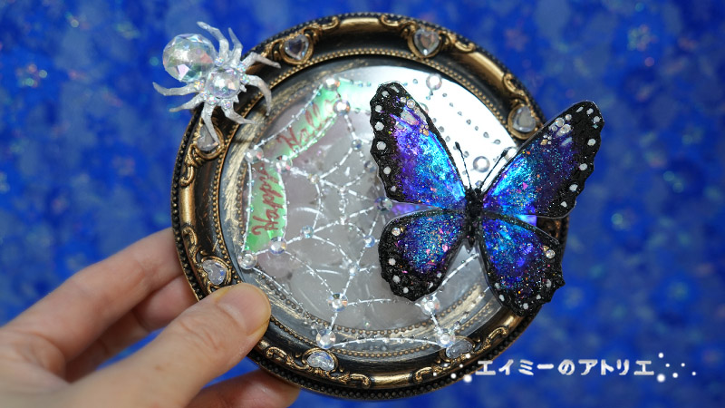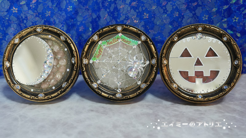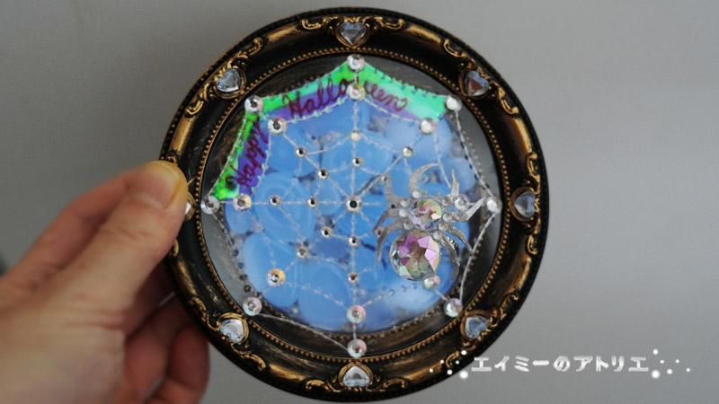 フォトフレームとラインストーンを使って、ダイヤのように輝く宝石のような「蜘蛛と蜘蛛の巣」を作りました。蜘蛛は指輪になっていて、光を浴びると美しくキラキラ光ります。しかし…暗闇では蜘蛛は黒くなり周囲が怪しく光ります。ハロウィンのオーナメント用に、「三日月」と「カボチャのおばけ」も作ってみました。こちらも暗闇では怪しく光ります。