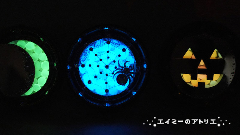 真っ暗闇で見ると…怪しく光ります!ハロウィンにぴったりの恐~い感じのオーナメントが出来上がりました。