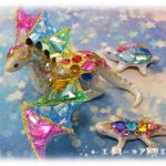 それぞれ体にニスを塗ると、きらめき度がアップします。動物をモチーフにした個性的なモンスター達が出来上がりました。カラフルなクラフトモンスターの完成です。