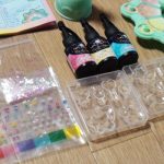 ボールチェーンを通す穴の部分に穴あけ棒を差しておいてから、ジェルを流し込みます。ピンク、ゴールド、ライトブルーのジェルを型に流し込んでみました。セットに入っているジェル3袋でちょうど、型にある大きなジュエリーが一つずつ作れます。(ちょうどミニサイズを作る分のジェルは不足しました。)