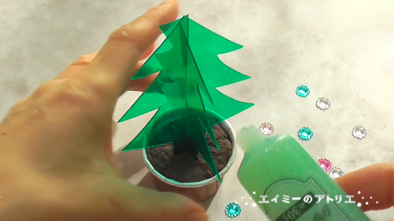 2枚のツリーをクロスさせて。粘土を詰めたカップに差し込みます。