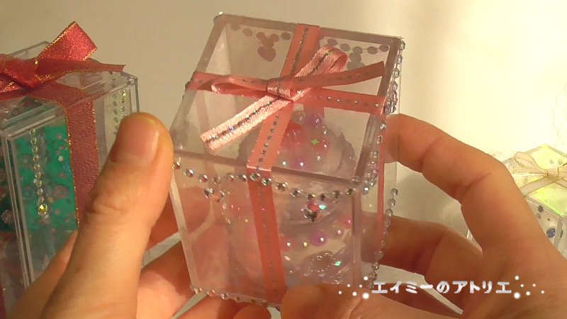ボックスに入れてリボンを貼り付け、ラインストーンで飾り付けて可愛くお洒落な感じにしてみました。こちらは、お誕生日プレゼントにもよさそうですね!