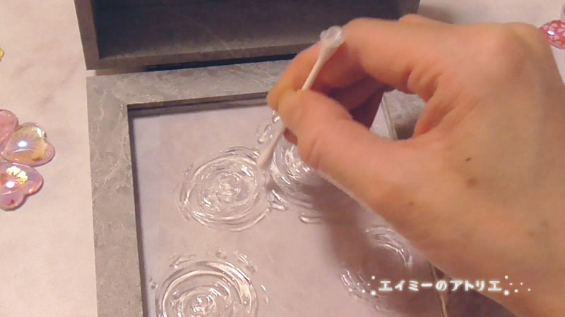 透明の蓋の裏側から、クリアカラーのホイップクリームのり水の波紋を描きます。のりをたっぷり塗って、綿棒で円をいくつも描きました。しっかり乾かします。