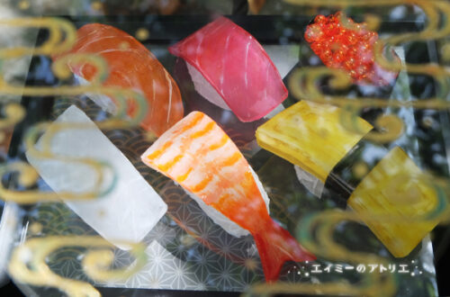 川となる部分のビーズの下にはアルミホイルを敷いて輝きを加え、ボンドで固めてみました。ボンドは固まっても透明にはならず、少し乳白色の色が残ってしまいますね。本当はレジン液を流し込んで固めたいところですが、ちょっと高価なので…今回は断念しました。代わりに、マニキュアをふりかけて艶ときらめきを加えたりしてみました。ニスを流し込むのでもよかったかもしれません。