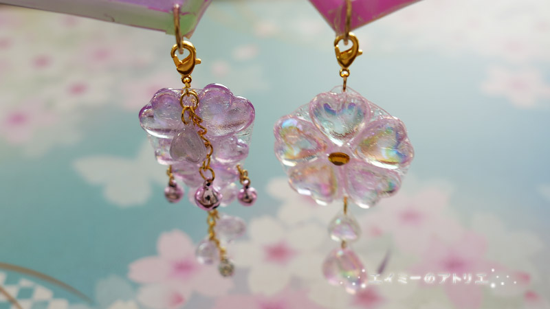 扇に合わせた桜と藤のチャームも作ってみました。うるちゅる感が凄いです。