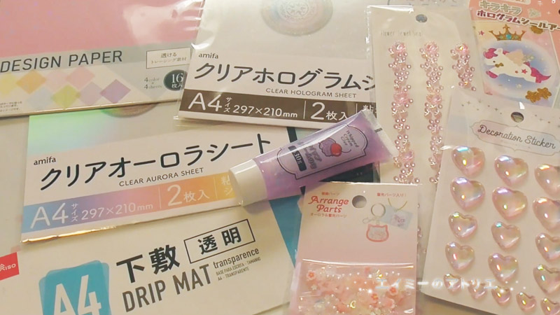 <①透明の下敷き、 ②クリアホログラムシート、③クリアオーロラシート、④ホログラムシート(キラキラホログラムシールアート)⑤デザインペーパー、 ⑥透明ちよがみ、⑦ホイップクリームのり、⑧デコレーションシール、 ⑨金のラメ、⑩アレンジパーツ、⑪両面テープ、⑫マスキングテープ、⑬Cカン、⑭チェーン、⑮カニカン、⑯接着剤、⑰コピー用紙>
