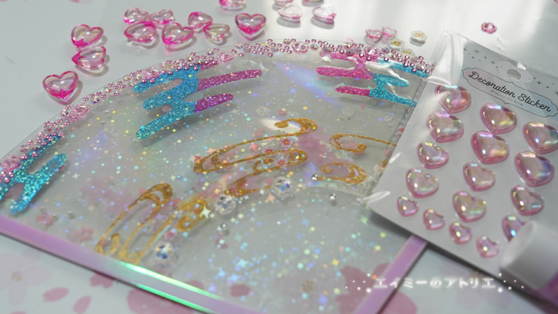 クリアオーロラシートを貼り付けた時に、ラメ付近にたくさん気泡が入ってしまいましたが…表面にハート型のドロップシール(デコレーションシール)で藤の花を貼り付けたら何とかいい感じの味になりましたので、これはこれでOKとしました。