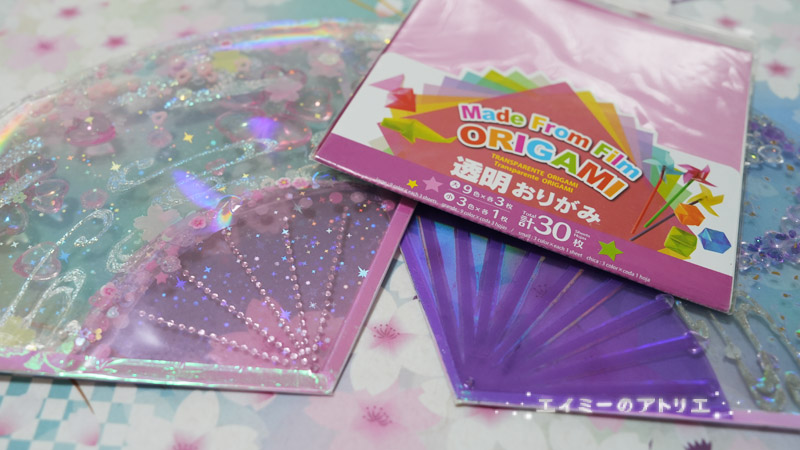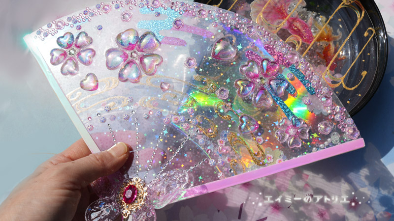 キラキラ×シャカシャカオーロラ色×オーロラ色の桜の扇の完成です。振ると、シャカシャカ音がして扇の中のパーツが動きます。扇の下には、クリスタルフェアリーを付けてみました。