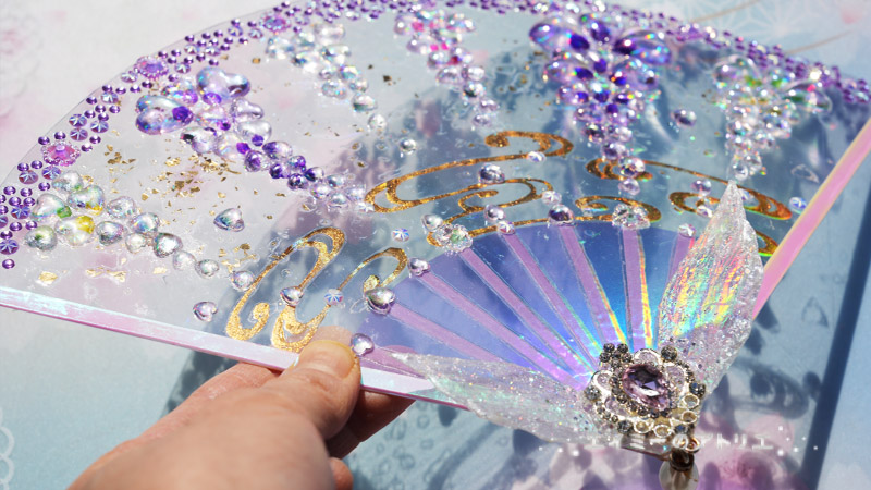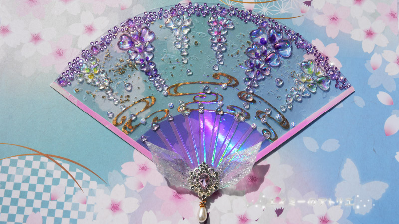 藤の扇はオーロラ×透明で、金色と紫色をベースにした大人っぽいデザインになりました。幻想的で綺麗な影を作ります。