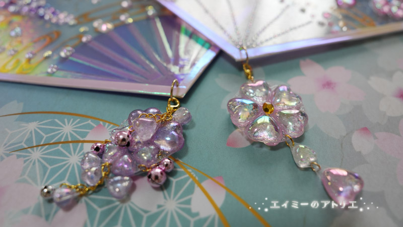 扇に合わせた桜と藤のチャームも作ってみました。うるちゅる感が凄いです。